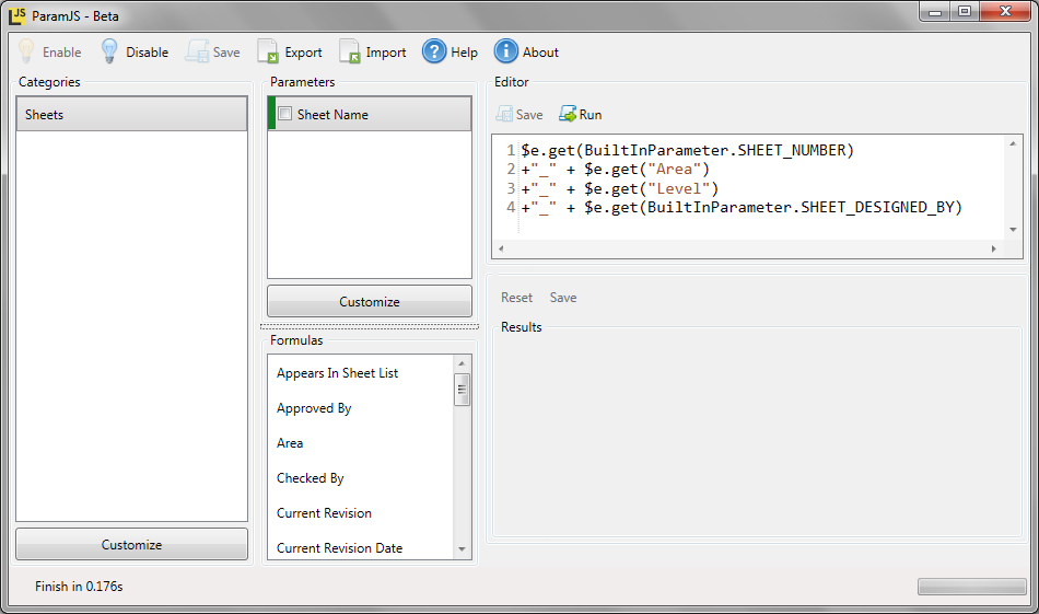 I can now drag and drop parameters from the “Formulas” list to the “Editor” panel. This creates automatically the correct line of code for calling this parameter. I drag some of my sheet parameters, add some “+” to concatenate them, and hit Run. We can see the result of my concatenation just below. I hit save, and my modification are added to my model.